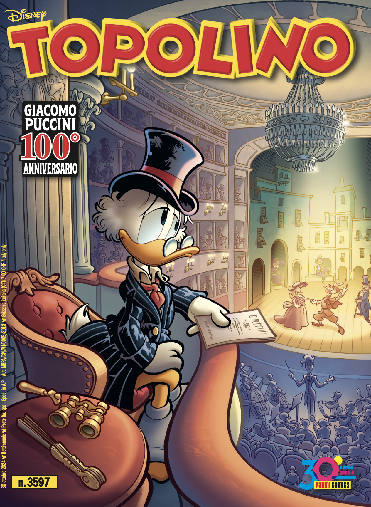 Nessun… dorma! In occasione dei 100 anni dalla scomparsa del Maestro dell’opera italiana, Panini Comics si prepara a celebrare il grande compositore toscano. Topolino 3597 disponibile in edicola e su Panini.it, a partire da mercoledì 30 ottobre, dà il via ai festeggiamenti in onore di Giacomo Puccini con l’imperdibile storia inedita Zio Paperone e l’opera inattesa scritta da Alessandro Sisti per i disegni di Simona Capovilla e con una suggestiva cover disegnata da Paolo Mottura.