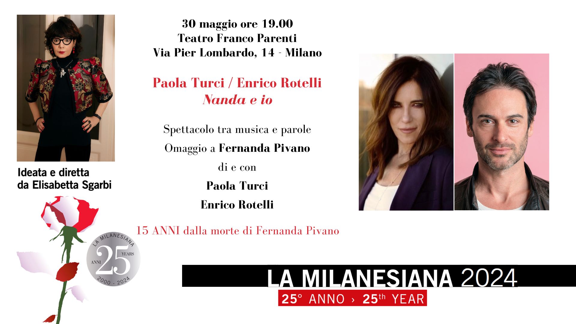 Il 30 maggio La Milanesiana di Elisabetta Sgarbi è al Teatro Parenti di Milano con “Nanda e Io”, lo spettacolo tra musica e parole di Paola Turci e Enrico Rotelli, dedicato alla scrittrice, traduttrice, giornalista Fernanda Pivano