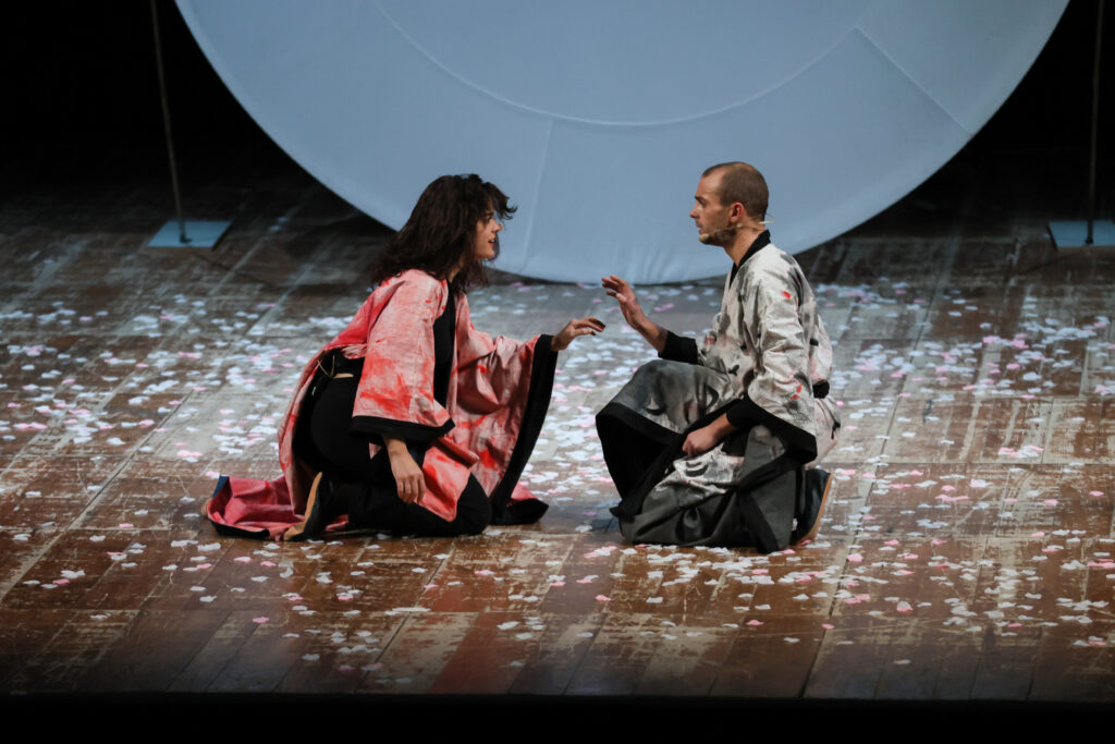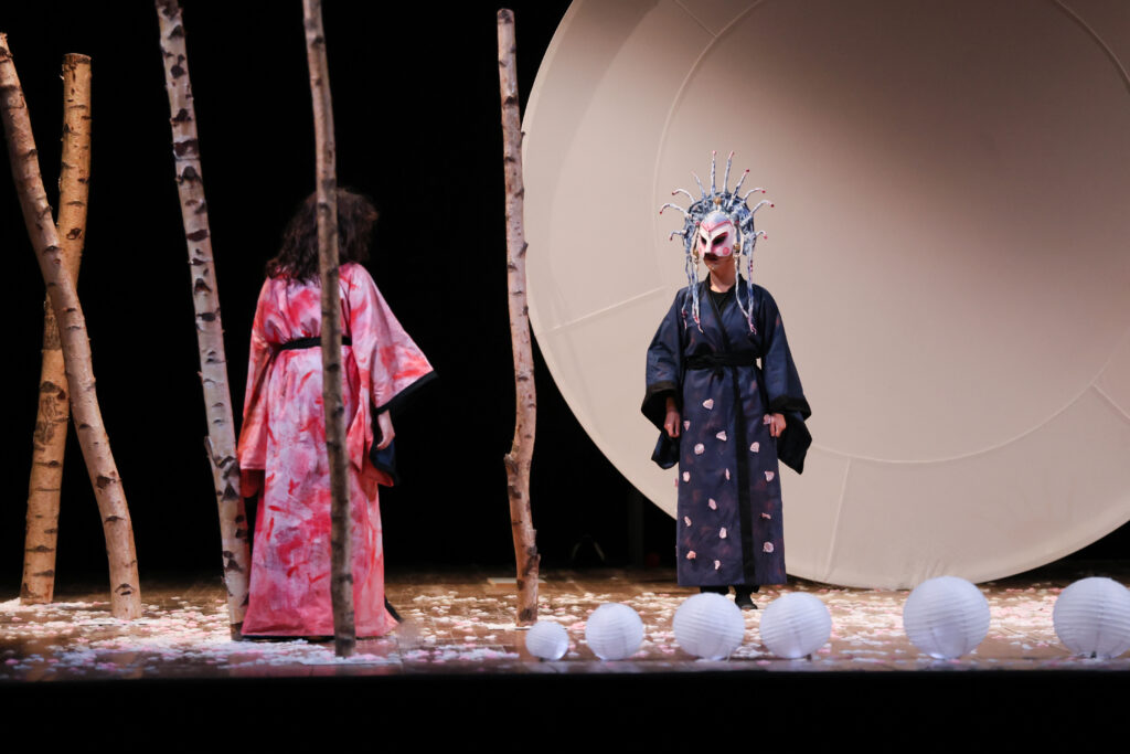 In una scena eterea appare un giardino di peschi spogli. I petali dei fiori ormai caduti a terra, le lanterne ancora appese ai rami. Tre personaggi dietro alle loro maschere, come delle ombre, appaiono sulla scena. Essi raccontano un’antica storia, quella della Principessa Turandot, vittima di una maledizione che ha coinvolto tutto il regno. Il suo cuore congelato non può amare, provare emozioni e così anche il suo regno perde vigore, luce e speranza. Solo l’arrivo di qualcuno di grande coraggio potrà rompere l’incantesimo che l’ha resa la Principessa di ghiaccio e riportare il suo regno all’antico splendore.